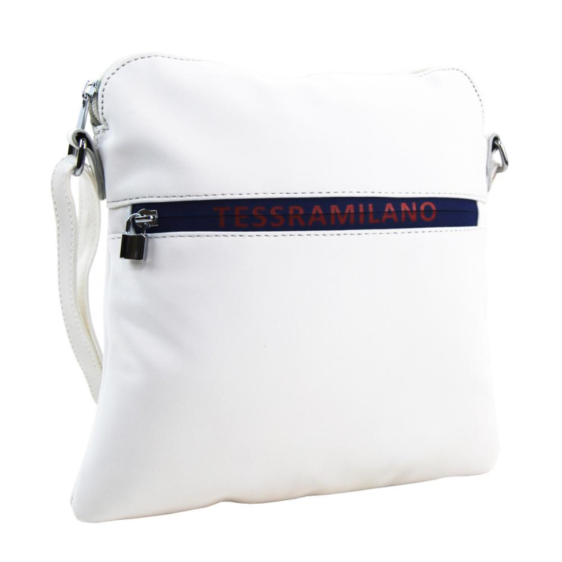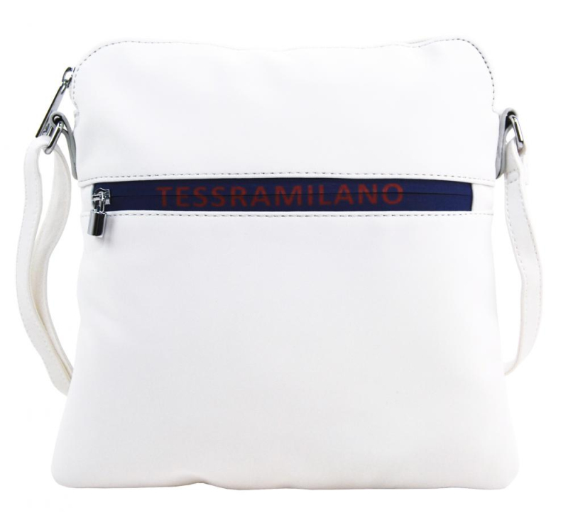 Pokud dáváte přednost sportovnějšímu outfitu , bude se Vám líbit tato textilní dámská crossbody kabelka s nápisem TESSRA MILANO na čelní straně.